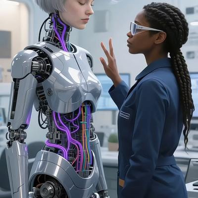 娱乐机器人在舞台上跳舞,配合灯光音乐做出灵动动作。